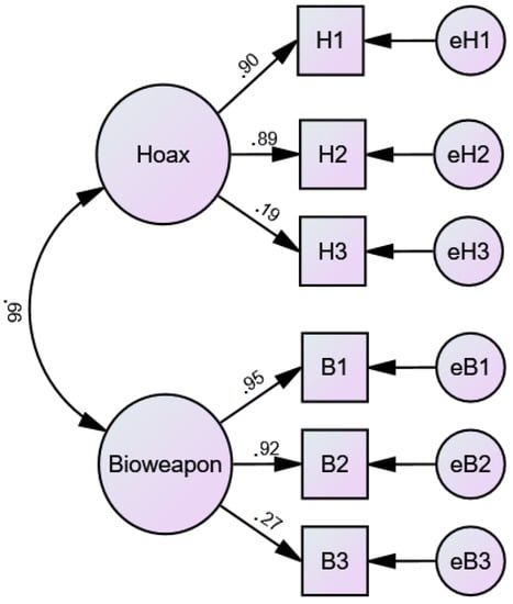 For the next step, we conducted a CFA for the two-factorial model of the COVID-19 Conspiracy Beliefs questionnaire (cf. Figure 2) []. Two items (one of each of the assumed factors “hoax” and “bioweapon”) showed a low factor-loading (0.19 and 0.27). For all other items, we observed excellent loadings of >0.88. The model fit indices reached high values despite the two critical items, indicating a good model fit (IFI = 0.972; TLI = 0.927; CFI = 0.972). The inter-correlation reached a relatively high positive value (r = 0.66), which is in line with the theoretical consideration by Imhoff and Lamberty [], reflecting the assumed “illogical” response tendency of participants scoring high on both factors at the same time.