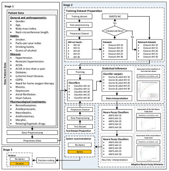 In line with what has been mentioned, this paper addresses the design and development of a novel intelligent clinical decision support system applied to the diagnosis of potential obstructive sleep apnea cases. To this end, starting with the information related to the patient’s health profile (anthropometry, habits, comorbidities and drugs taken), and deploying a series of algorithms based on Machine Learning that operate concurrently [49,50,51,52,53], as well as a correcting block based in the joint use of an ANFIS system and a specific heuristic algoritm, the system generates a series of alarms, from which it is possible to estimate whether a patient suffers from the pathology, as well as determine its degree of severity.