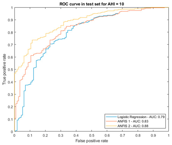 Once the correcting levels were completed and the optimal threshold was identified, it was possible to study the results of the system’s proof test. Figure 5 shows the ROC curves on the test data set for the Logistic Regression model, as well as the ROC curves associated with the two levels of the correcting block (at the output of ANFIS 1 and ANFIS 2, respectively), highlighting the clear and considerable associated improvement achieved, moving from an AUC value of 0.79 to 0.83 in the first correcting level, and from 0.83 to 0.88 after the application of the second correcting level.