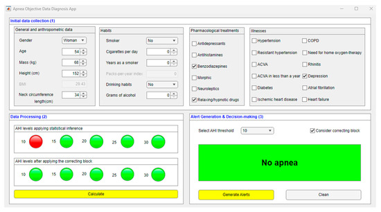 Figure 2 shows a screenshot of the graphical user interface of the software artifact. Three main regions may be distinguished in this figure. Region (1) is related to the collection and pre-processing of the information related to the patient. Region (2) represents the data-processing stage and allows visualizing the AHI levels obtained in each of the statistical classifiers, as well as those obtained after the correcting process, using for that a series of indicator lights. Finally, Region (3) allows the user to visualize alerts and generate recommendations.