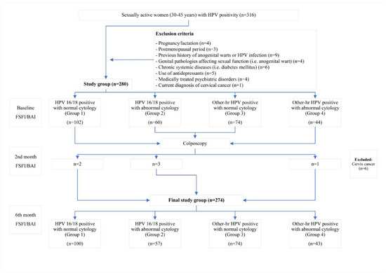 All patients included in the study were given an information sheet about the details of the study. The demographic and clinical characteristics of the patients, including age, gravida, contraception method, and smoking history, were recorded. The cytological findings were grouped as normal and abnormal cytology (low-grade intraepithelial squamous lesion (LG-SIL), high-grade intraepithelial squamous lesion (HG-SIL), and atypical squamous cells of undetermined significance (ASC-US)) [15,16]. All patients filled out the Beck Anxiety Inventory (BAI) and the Female Sexual Function Index (FSFI) at the start of the study [1,4]. The study sample was categorized into four groups based on the HPV genotypes and cytology findings: (a) HPV 16/18-positive with normal cytology (Group 1); (b) HPV 16/18-positive with abnormal cytology (Group 2); (c) Other-hr HPV-positive with normal cytology (Group 3); and (d) Other-hr HPV-positive with abnormal cytology (Group 4) [4]. All patients were informed about the results of the HPV test and the cytology results. The guidelines of the Turkish national cervical cancer screening program were followed [4,14]. Accordingly, all patients in Group 3 were referred to have a colposcopic examination as part of the institutional policy to check for the presence of abnormal cervical imaging or post-coital bleeding. The patients who were diagnosed with CIN 2 and CIN 3 were referred to have the loop electrosurgical excision (LEEP) procedure. The patients diagnosed with cervical cancer (n = 6) were excluded from the study. The patients’ psychological status was assessed three times: when they were notified about their HPV infection (baseline), when they were informed about the results of the colposcopic biopsy, when the decision to proceed to LEEP was made (the two-month follow-up), and during the six-month follow-up (Figure 1).