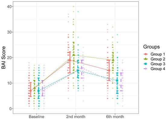 In Figure 2, it can be seen that there were significant increases in the BAI scores over time compared to the baselines scores in all groups (p = 0.001 for all). The patients in Groups 1 and 2 had significantly higher BAI scores measured during the second-month follow-up than those in Groups 3 and 4 (p < 0.05). There were no significant differences between Group 1 and Group 2 and between Group 3 and 4 in BAI scores measured during the two-month follow-up (p > 0.05). Likewise, as can be seen in Figure 2, the patients in Group 2 had significantly higher BAI scores measured during the six-month follow-up than the patients in other groups (p < 0.001 for all cases). Additionally, the patients in Group 1 had significantly higher BAI scores measured during the six-month follow-up than those in Group 3 and Group 4 (p < 0.001 for both cases). There was no significant difference between Group 3 and Group 4 in BAI scores measured during the six-month follow-up (p = 0.983). The median increases in BAI scores between the two-month and six-month follow-ups were higher in Groups 2 and 1 than those in Groups 3 and 4 (Table 3, Figure 2).