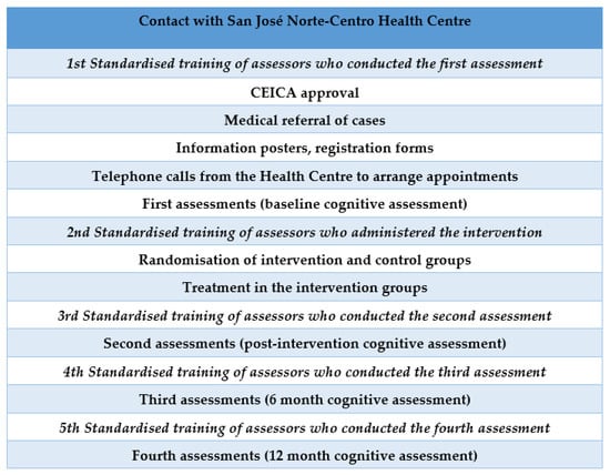 Inclusion in the study was based on the following criteria: (1) aged ≥65 and (2) ≥24 score on the MEC-35 (validated Spanish version of the Mini-Mental State Examination (MMSE)), i.e., no cognitive impairment [], and presentation of SMC. Individuals were excluded if they (1) had received CS in the last year; (2) were institutionalised; (3) obtained a Lawton–Brody index (L–B) ≥ 3; (4) reported more than 6 points on the abbreviated Goldberg anxiety scale; (5) reported ≥12 points on the abbreviated Yesavage depression questionnaire (GDS-15); (6) scored <60 points on the Barthel index (BI); (7) presented deafness; (8) presented blindness; (9) presented neuropsychiatric disorders; or (10) presented motor disturbances.