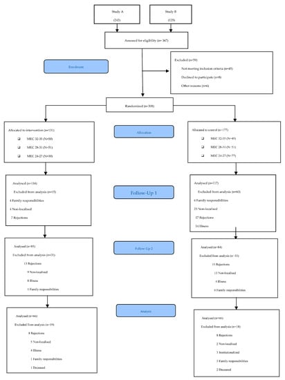 Participants were recruited at the San José Norte-Centro Health Centre in Zaragoza (Spain). Randomisation was performed using an opaque box in which participants’ file numbers were placed and an anonymous person extracted the selected numbers. The lead author verified the inclusion criteria of the participants. A total of 367 candidates were evaluated. The inclusion criteria were met by 308 participants, who were distributed into two groups: 131 in the intervention group (IG) and 177 in the control group (CG). The assessors and occupational therapists delivering the intervention were different. In addition, the assessors were blinded and were different in each of the assessments conducted. The protocol for the different phases of the study can be viewed in Figure 1. The flow diagram of the participants can be viewed in Figure 2.