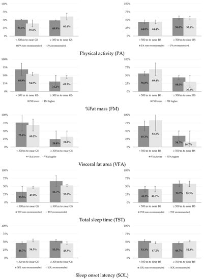 Figure 2. Classification of physical activity levels, adiposity, and sleep outcomes according to distances to green (300 m) and blue spaces (500 m); GS—green space; BS—blue space.