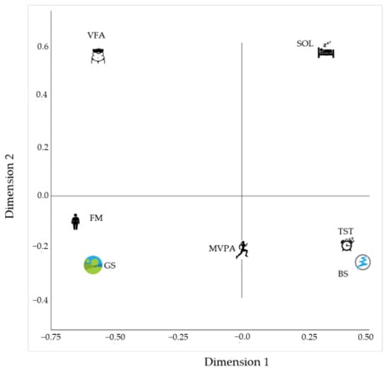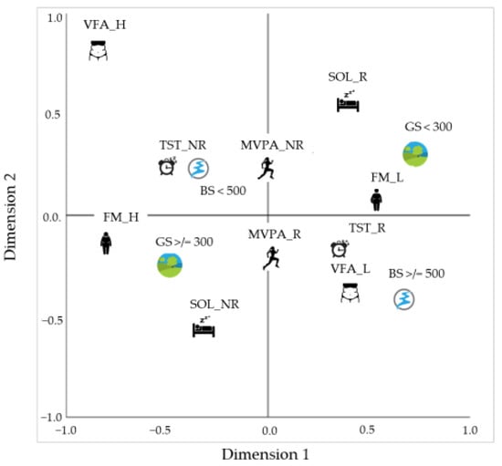 The numeric data were presented as mean ± standard deviation and qualitative variables were presented as absolute frequencies and percentages. To assess the relative contributions of the accessibility of green and blue spaces, nonlinear canonical correlation analysis (OVERALLS) was used. The OVERALS technique is a nonlinear multivariate exploratory analysis used to deal with variables with different levels of measurement, such as numerical, ordinal, and nominal levels, and that are defined by at least one set of variables. The purpose is to determine how similar these sets of variables are and how the projection of the data in a low-dimensional space can be achieved, accounting, as much as possible, for the variance in the relationships among the sets, and at same time to establish the similarities between the sets. In OVERALS, as in principal component analysis (PCA), eigenvalues are associated with each dimension and indicate to what extent every single dimension accounts for a good fit of data in a low-dimension space and, in a centroid plot, score objects for categories of each variable that are nearest to each other, indicating a higher degree of similarity [80]. We used 13 variables and classified them into 3 sets: (1) distance to green and blue space; (2) accelerometry variables (MVPA and sleep); and (3) body composition variables (%FM and VFA). The labels of the sets, variables, and categories in data, and the symbols that represent the categories in the graphics, are given in Table S1. All analyses were carried out using IBM SPSS, version 27.0 (Chicago, IL, USA).