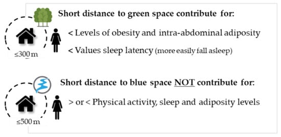 Our findings reveal that women with green spaces near their homes showed lower levels of total and intra-abdominal adiposity and better sleep onset latency values. However, we found no relationship between green space with physical activity and sleep time. Regarding blue spaces, the distance to these environments did not relate to any health indicator analyzed in this study (Figure 5).