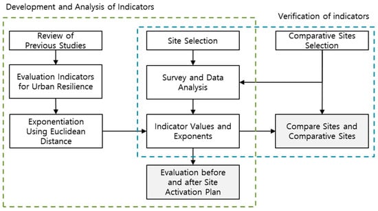 The methodology is shown below (Figure 1). First, to establish the measurement method for each indicator and the rating standard for the index value, select an urban resilience evaluation index through a review of previous studies. Second, establish the indexing system using the Euclidean distance based on grading value. Third, after selecting an urban regeneration area for urban resilience evaluation, identify the current status of the target site. Fourth, obtain data on the analysis target site and derive the evaluation index. Finally, check the evaluation index after the regeneration project by reflecting the urban regeneration plan for each target site; then, compare the evaluation index both before and after the project. Additionally, after selecting a non-decadent area near the target site to verify the resilience index, compare and analyze the index values through comparison between regions.