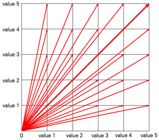 In other words, if the measured value varies from one to five, 25 (5 × 5) classification values can be calculated using two measurements, and it can easily assess the significance as an interpretation of a value. The calculation method of the Euclidean distance for indexing varies, depending on the number of items used for calculation. In terms of urban resilience indicators, the classification can be largely performed using one to three measurements of indicators.