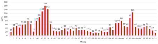 The pattern of absenteeism shown in this study differs from that shown for other European countries []. Studies in other EU countries show two recurring annual peaks between 2015 and 2021, around mid-August and at the end of December. This typical increase in absenteeism is less visible in the data.