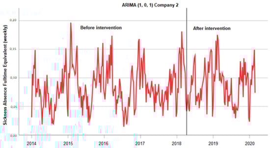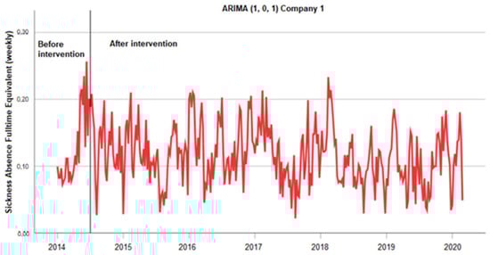 The Box–Jenkins autoregressive integrated moving average (ARIMA) intervention time series analysis was used to quantify the impacts of self-certification and merging on trends in the weekly rates of absenteeism. ARIMA models were used to address the inherent dynamics of the series. Coding was as follows: company 1—before merging (beforeQ3 in 2014), 0 and after merging (from Q3 in 2014), 1; company 2—certification by physician (before Q2 in 2018), 0 and self-certification (from Q2 in 2018), 1.