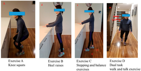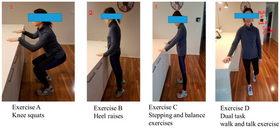 The “Safe Functional Home Exercise” program for people with dementia was a 12-week program that used a simplified approach with a set of four exercises. Briefly, Exercise A is knee squats (knee strengthening exercise), Exercise B is heel raises (ankle strengthening exercise), Exercise C is a stepping and balance exercise (body weight shift and balance training exercise) and Exercise D is a dual task of walk and talk exercise (concurrent mobility and cognitive task to train dual task ability). Each exercise had two levels: Level 1 (easy) exercises were performed with hand support (Figure 1), while Level 2 (moderate) exercises were performed without hand support (Figure 2). More photos for level 1 and 2 exercises A, B, C and D are shown in Supplementary Material.