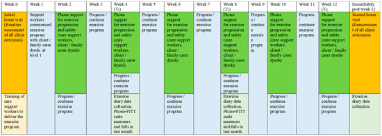 Care support workers, clients and family carers were provided with diaries and instructions to record the exercises, the duration and days of exercise performance, if adverse events including falls occurred during the 12-week program, and the reasons if not meeting the number of days for the exercise target. In addition, care support workers could enter in their diaries if any care was missed and extra time spent outside of their care shift because of the exercise program. Any alternate physical activity performed in place of the exercise program when a client did not wish to perform the exercises was also recorded.