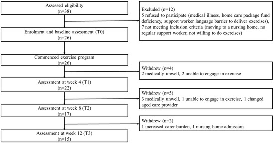 A total of 38 potential home care client/family carer dyads from two aged care organisations were assessed for eligibility. Of these, 12 were excluded due to refusal for different reasons and not meeting inclusion criteria. Participant flow through the study is shown in Figure 4.