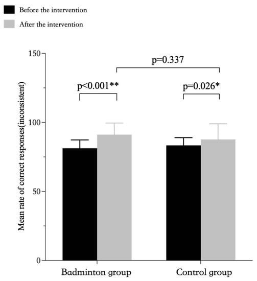 Multivariate repeated-measures ANOVAs were performed to assess the changes in the inhibitory control indicators as assessed in the Stroop task between the two groups of participants (badminton vs. control) over time (before vs. after intervention) (Table 4). There was a significant main effect of time for the participant response time in the inconsistent condition of the Stroop task. For the response time in the consistent condition, there was a significant main effect of time. For accuracy in the inconsistent condition, there was a significant main effect of time and time by group interaction. For accuracy in the consistent condition, the main effect of group was statistically significant, and the main effect of time and the time by group interaction were also significant.