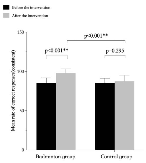 The repeated-measures ANOVA results showed a significant interaction for accuracy in both conditions between the badminton intervention group and the control group. The results of the simple effects analyses showed that in terms of accuracy (inconsistent condition), there was a significant difference between the pre-intervention and post-intervention Stroop test results and the pre-intervention and post-intervention test results in the control group for the badminton group over time, but the post-intervention test results between the two groups were not statistically significant (Table 5, Figure 1). The results of the simple effects analyses showed that in terms of accuracy (consistent condition), there was a significant difference between the pre-intervention and post-intervention Stroop test results and the post-intervention test results between the two groups for the badminton group over time, but the pre-intervention and post-intervention test results in the control group were not statistically significant (Table 5, Figure 2).