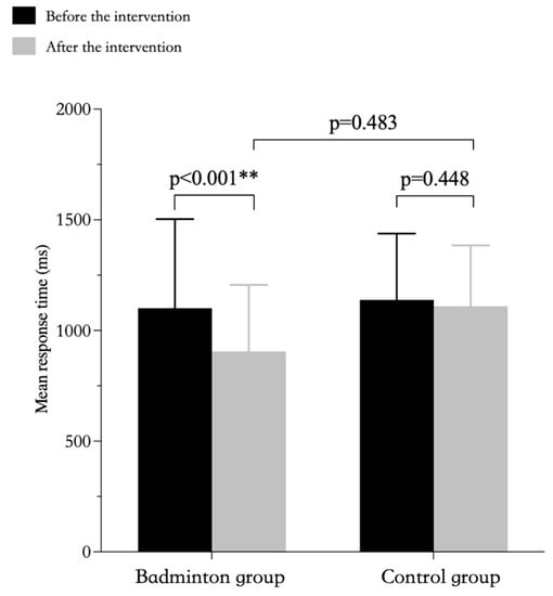 Research shows that the working memory of people who are approximately 7 to 10 years of age can be significantly increased []. Although adults with mild intellectual disabilities may have missed the sensitive period in the development of working memory because their prefrontal function and other brain functions may be reduced compared with those of healthy people of the same age, the increased use of the brain regions associated with working memory in the present badminton intervention may have led to an improved working memory.