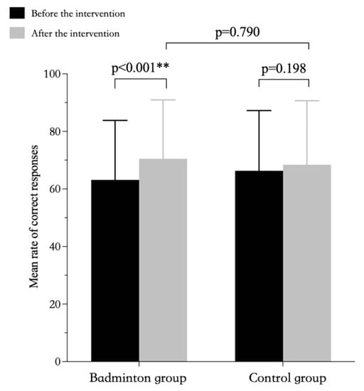 However, there are different views on the improvement in cognitive flexibility associated with badminton. Some researchers assert that badminton significantly promotes cognitive flexibility after an acute intervention or after a period of time [,]. However, other researchers argue that badminton does not promote cognitive flexibility as well as it enhances inhibitory control and working memory [,]. Given the findings of the present study, the differing results of the various studies may be related to the design of the intervention program. In previous studies, long-term badminton exercise had a better effect on executive function than short-term badminton exercise did []. For the badminton intervention program used in the present study, the first 9 weeks were focused on fixed points and single technical movements. In the last 3 weeks, the skills learned in the first 9 weeks were combined for comprehensive practice, with sparring and competition exercises requiring high cognitive flexibility being added. However, we believe that the amount of time in which these comprehensive exercises were conducted was insufficient, such that although the switching reaction times and correct rates in the badminton group improved after the intervention, the improvement was not statistically significant.