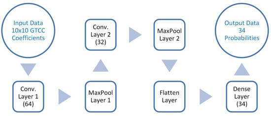The implemented CNN consists of two convolutional layers with a 2 × 2 kernel followed by two pooling layers. A total of 64 neurons have been used in the first convolutional layer, while only 32 neurons have been used in the second one. Input data consisting in 100 GTCC coefficients have been previously formatted into a 10 × 10 matrix. The activation function is Rectifier Linear Unit (ReLU). The last two layers are a flattener layer and a dense output layer with 34 neurons, which uses a sigmoid activation function to adapt the model to a multilabel classifier. Moreover, an Adam optimizer with a learning rate (LR) of 0.001 has been used and the loss function was binary_crossentropy.