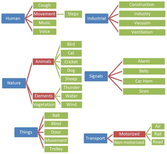 - Vidaña-Vila, E.; Navarro, J.; Stowell, D.; Alsina-Pagès, R.M. Multilabel Acoustic Event Classification Using Real-World Urban Data and Physical Redundancy of Sensors. Sensors 2021, 21, 7470. [Google Scholar] [CrossRef]