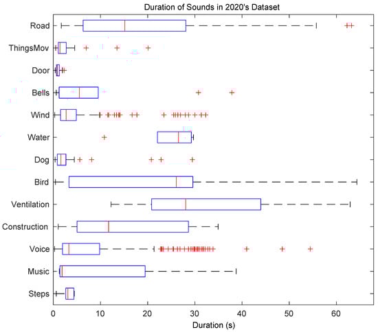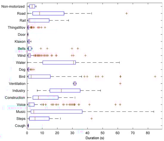 From Table 1 it can be concluded that this dataset is highly imbalanced. A total of 2 out of the 13 remaining sound classes, Bird and Road, appear in more than 30% of the total labelled time and in more than 40% of all available locations. Moreover, six categories, Steps, Music, Water, Bells, Door and ThingsMov., have a very poor representation with less than 2% prevalence overall. The single and multiple overlapping percentages significantly differ from one element to another. The same happens with the foreground/background placement ratio. Even though in many categories the foreground and background times are approximately balanced, there are also some extreme cases such as Music, which are essentially background events, or Doors, which have a very poor presence but are always placed foreground. The mean duration of these sound events also presents a wide range of values depending on the type of sound. For a further evaluation of the duration of the events in the campaign, Figure 4 shows a boxplot of the duration of each category in the dataset. Whereas some events have a mean duration shorter than 5 s (e.g., ThingsMov, Door, Wind, Voice or Music), there are events that last for more than 20 s (e.g., Road, Water, Birds or Ventilation).