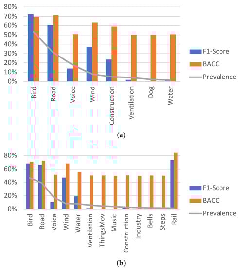 Although a significant part of the related literature is covered in the aforementioned review, other more recent contributions include some publications related to the last DCASE challenges [60,61], more focused on indoor domestic sounds, and Vidaña-Vila et al.’s work [62]. In this study, the authors developed a polyphonic sound event classifier for urban data using physical redundancy of sensors. They performed two recording campaigns in Barcelona obtaining almost 300 min of sound data with up to 21 sound classes and implemented a two-stage classifier that benefits from the redundancy sensors to improve the classification performance. The instance average F1-Scores after the first stage ranged from 46% to 75% and the class average F1-Scores ranged from 12% to 39%, depending on which data augmentation method was applied.