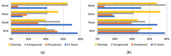 Comparing Table 1 and Table 2, it can be concluded that, although the dataset from the 2021 campaign is also very imbalanced, the difference of sound prevalence among categories is not as magnified as in 2020. The percentage of time of appearance for each category in the 2020 dataset had a standard deviation of 1313.3 s. This statistic falls to 932.64 s in 2021 as seen in Table 3. The two more prevalent categories (Birds and Road) are also more balanced in 2021. While in 2020 there was a significant 22.15% difference in the percentage of total time between both of them, the gap falls to 7.59% in 2021. The number of categories which appear more than 2% of the time increases from 7 in 2020 to 10 in 2021. Some of the differences between both datasets are accidental, such as the higher percentage of locations where it was raining in 2021 compared to 2020. However, part of the higher range of existing sounds in 2021 can be explained because the 2020 campaign was conducted during the COVID-19 lockdown while in 2021 most of the mobility and activity were back to normal [64].