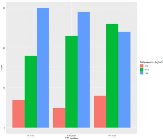 Participants were mostly 50–75 years old, and women participated more than men (Table S1a,b—Supplementary Materials). They were primarily overweight/obese (Figure 1). Most of the patients also had MS, as confirmed by the fact that a large proportion of them expressed the abdominal (visceral) type of obesity (wc ≥ 88 cm for females and ≥102 for males), and the majority were diagnosed with hypertension. There were patients with short-term (0–5 years) and long-term (>10 years) hypertension and T2D duration. Most of the patients were in a good nutritional state, and only a small proportion were at risk of malnutrition. No individuals had severe sarcopenia, as indicated by the fact that no one had mac ≤ 22 cm. Only about a fifth of patients were frail (31/170). In most patients, HbA1c was <8.5%, indicating well-controlled hyperglycemia.