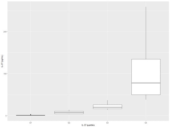 We assessed which variables significantly changed among quartiles of IL-37 using the following cut-off values: between quartiles 1 and 2–3.40, between quartiles 2 and 3–13.40, and between quartiles 3 and 4–38.00. There were several variables that showed significant variations. These included erythrocytes, hemoglobin, and hematocrit, indicating chronic inflammation, and variables HbA1c (a borderline significance) and LDL-cholesterol, indicating metabolic disorders (Table S2—Supplementary Materials). All these variables can also be considered as signs of blood viscosity [52]. Of comorbid disorders, only CAD and gastrointestinal diseases were shown to be significant (Table S3—Supplementary Materials). In addition, the new generation of oral antidiabetic drugs, including DPP4inh (Dipeptidyl peptidase-4 inhibitors), SGLT2inh, and GLP1ra taken as a group, have shown significant variations.