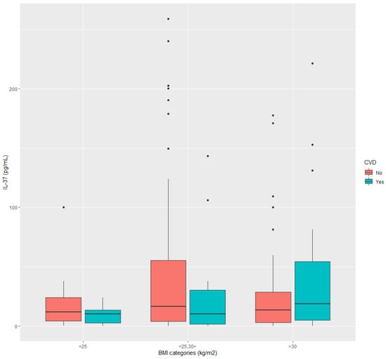 IL-37 in diabetic patients with/without CVD across categories of BMI: low (BMI < 25 kg/m2), normal (BMI 25–30 kg/m2) and high (BMI > 30 kg/m2).