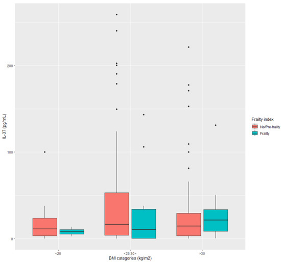 Figure 3 and Figure 4 show how IL-37 changes in dependence on two variables with opposite effects on IL-37 levels. The differences in both figures were statistically evaluated, i.e., if the respective data samples were normally distributed (Shapiro–Wilk test), the difference was investigated by the ANOVA test. Otherwise, we applied the Kruskal–Wallis test. The following were observed from Figure 3: in data sample BMI < 25 kg/m2 (no significant difference), BMI 25–30 kg/m2 (no significant difference), BMI > 30 kg/m2 (no significant difference), between BMI < 25 kg/m2 and BMI 25–30 kg/m2 (no significant difference), between BMI 25–30 kg/m2 and BMI > 30 kg/m2 (no significant difference). However, the tendency of elevated IL-37 in diabetic patients with CVD can be seen if they are obese (BMI > 30 kg/m2). Data from Figure 4 showed: in data sample BMI < 25 kg/m2 (no significant difference), BMI 25–30 kg/m2 (no significant difference), BMI > 30 kg/m2 (no significant difference), between BMI < 25 kg/m2 and BMI 25–30 kg/m2 (no significant difference), between BMI 25–30 kg/m2 and BMI > 30 kg/m2 (no significant difference). Similarly, as in the previous case, the tendency of IL-37 to increase can be seen in frail diabetic patients if they are obese, compared to those who are not.