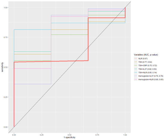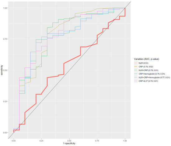 Interestingly, the only model that showed significant discriminative ability of determined cut-off values of IL-37 (expressed as AUC) was the one where IL-37 was combined with TSH in discriminating between women with and without MS (Table S5—Supplementary Materials) (Figure 5). The combination with TSH also improved the diagnostic accuracy of the basic NLR model. ROC analysis also indicates that models involving CRP are better than NLR in discriminating among diabetic patients according to BMI categories (Figure 6).