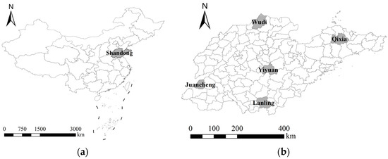 Sample location (a) The location of Shandong Province; (b) The five randomly selected counties in Shandong Province.