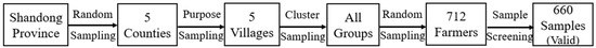 We conducted a household survey in Shandong Province in 2022 to collect data for this study (Figure 2a). Shandong was chosen as a sample province for the following reasons. First, it is a major agricultural province in China with some of the highest rates of high-standard farmland and farmland transfers in the nation (over 69% and 42.6%, respectively). Second, it is also composed of coastal and inland areas distributed in mountains, hills, plains, and other landforms. These factors are conducive to ensuring the diversity and representativeness of the sampled farmers. The survey was divided into four steps (Figure 3). First, to ensure the representativeness of the sample regarding region and topography, Shandong Province was divided into five regions and one county was randomly selected from each region, including Yiyuan (the central), Wudi (northwest), Juancheng (southwest), Lanling (south), and Qixia (northeast), as shown in Figure 2b. These counties are distributed in the plains, mountains, hills, and other landforms. Subsequently, a sample village was selected from each county to further improve representativeness using purposive sampling. These sample villages had their characteristics in scale, industrial structure, style, features, etc. Subsequently, all groups in each sample village were investigated using cluster sampling. Finally, farmers were selected from each village group through random sampling of questionnaires. A total of 712 questionnaires were collected; 660 valid samples were obtained, and 52 invalid ones were eliminated. As a result, the sample efficiency is 92.7%.