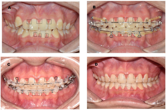 A total of 588 targeted gingiva samples were included. The gingiva selected included six points of papillary gingiva in the maxillary and mandibular anterior incisors (FDI dental numbering system: Nos. 13, 12, 11, 21, 22, 23, 43, 42, 41, 31, 32, and 32) from 25 participants. As the orthodontic treatment progressed, four IOPs were taken before orthodontic treatment (BO, see the Figure 1A), mid-point of orthodontic treatment (BO, see the Figure 1B), three-quarters of the way through orthodontic treatment (TO, see the Figure 1C), and immediately after debonding (IDO, see the Figure 1D).