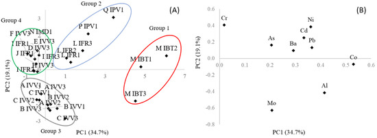 Principal Component Analysis of toxic inorganic elements in plant-based yogurts. Graphs of scores (A) and loadings (B). Group 1 (red circle): sample of brand M; Group 2 (blue circle): samples of brands L, P and Q; Group 3 (gray circle): samples of brands A, B and C; Group 4 (green circle): samples of brands D, E, F, G, H, I, J, K, N, O and R.