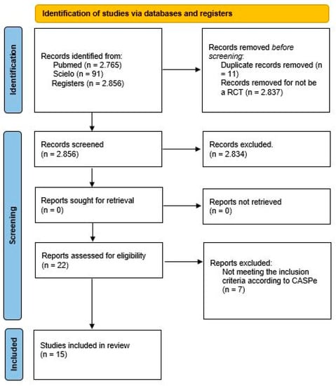 In total, 15 articles were chosen for systematic review. According to the critical evaluation instrument CASPe, 7 articles were excluded (Table 3). Figure 1 shows the PRISMA flow diagram. The articles chosen are as follows: