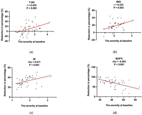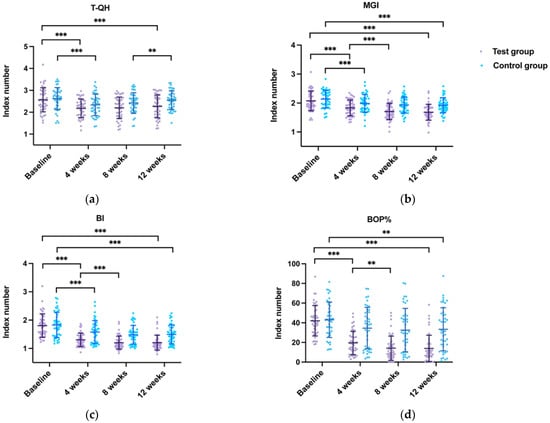 | BOP% | 4 weeks | test | 19.53 ± 11.96 | −43.52% | 0.001 b |