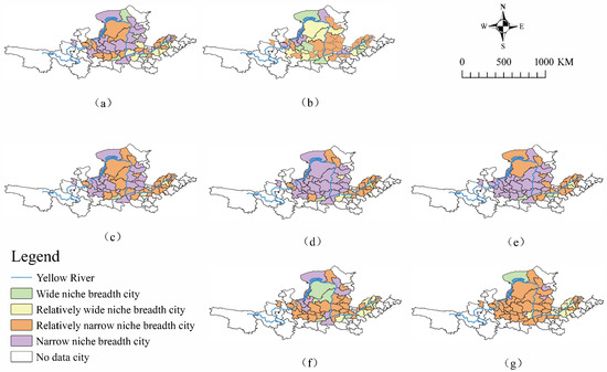 Spatial distribution of the niche breadth in the YRB cities for the period 2011 to 2020: (a) Spatial distribution of the niche breadth of infrastructure resources. (b) Spatial distribution of the niche breadth of service industry resources. (c) Spatial distribution of the niche breadth of openness resources. (d) Spatial distribution of the niche breadth of innovative resources. (e) Spatial distribution of the niche breadth of industrial resources. (f) Spatial distribution of the niche breadth of agricultural resources. (g) Spatial distribution of the niche breadth of ecological environment resources.