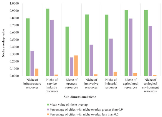 The sub-dimensional niche overlap values for each YRB city in 2020 were calculated and statistically analyzed according to Equation (11) in Section 2.2.3. The percentages of the number of cities with niche overlaps greater than 0.9 and less than 0.5 among the 7 sub-dimensional niches are shown in Figure 4.
