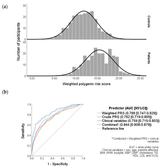 (a) Weighted PRS distribution in controls and patients and (b) receiver operating characteristic (ROC) curves of clinical variables, weighted and crude PRS.