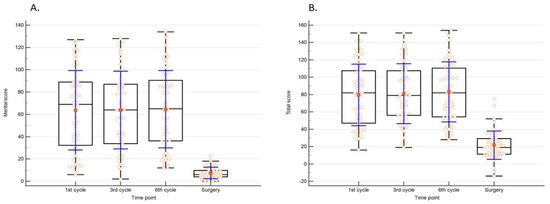 Significant differences regarding (A). mental and (B). total score in MFSI-SF in term of study points.