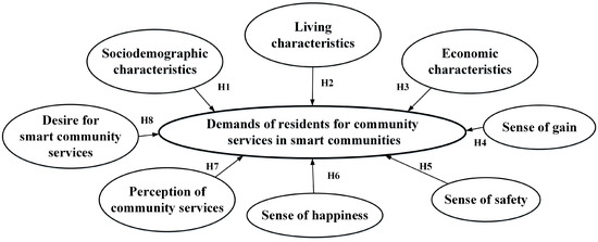 In light of these hypotheses, a comprehensive conceptual framework was developed to explore the factors that influence residents’ demands for a wide range of community services in smart communities, which is provided in Figure 1.