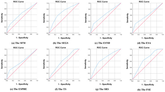 An illustration of whether the predicted probabilities match the actual results can be found in the classification table. Table S4 indicates that the odds of correct predictions for the y13, y28, y31, y32, y34, y43, y44, and y56 were 83.3, 81.9, 81.0, 81.9, 83.3, 81.0, 82.4, and 86.0% successively, which exceeded 80%. Clearly, predictions can be made with these 8 models. Moreover, the ROC curve provides a visualization of the accuracy of the prediction according to the relationship between the sensitivity and 1- specificity [86,87]. It is accepted that a larger area under the ROC curve translates into a better prediction for the model. The ROC curves of the 8 models that indicate respondents’ original demands and predicted probabilities are shown in Figure 3. From another perspective, the areas under the curves all exceeded 0.580, validating the good prediction performance of the models.