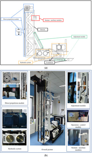 The modular theory [35] is used to design and produce the C-DP drilling rig, which is composed of the direct propulsion module, hydraulic system, adjustment module, and the operation—control module and stratum—auxiliary module. The proposed C-DP drilling rig for contaminated sites can carry a variety of in-situ testing devices and different pilot bits, which can also perform precise direct push drilling at different angles and deviation correction tests.