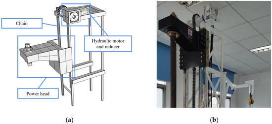 The direct propulsion module is the core module that is made up of the derrick, duplex chain, hydraulic motor, and power head. It is used to carry the loads during the drilling operation. The chain, the movement of which is controlled by the different speeds and steering of the hydraulic motor, provides direct pushing and pulling power for the module. This approach minimizes rig space requirements and increases drilling depth in the single pass compared to conventional hydraulic direct push rigs. In addition, chains as a direct power source for drilling rigs have more forms of monitoring options. The model and the physical drawings of the direct propulsion module are shown in Figure 4.