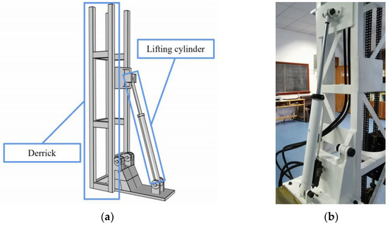 Model and physical drawing of the lifting cylinder. (a) Model drawing; (b) Physical drawing.