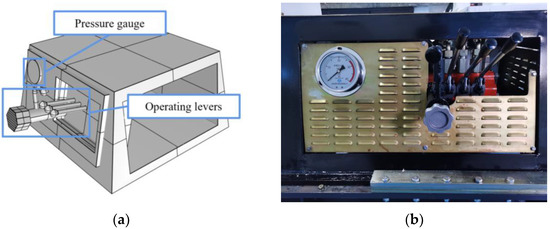 The operation—control module is one of the human-computer interaction modules that is used to control the actions of the direct propulsion module and the regulating module. The module includes the pressure gauge, as well as the operating levers and their control valves. The model and physical drawings of the console are shown in Figure 6. The pressure of the hydraulic system is displayed in real time, which can avoid the damage of thr C-DP drilling rig caused by excessive working pressure. The module also can adjust the drilling speed (coarse adjustment/fine adjustment) and angle (0–90°). All adjustments of the module are stepless, allowing continuous changes of input pressure, drilling angle and drilling speed. This approach allows the adjustment of drilling parameters to be more suitable for a wide range of direct push drilling situations.
