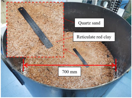 The constructed homogeneous simulated soil layer is shown in Figure 7, which was mixed 1:1 with reticulate red clay and quartz sand. Reticulate red clay was taken from the foothills of Yuelu Mountain, Changsha, Hunan, China. The physical parameters of the reticulate red clay are shown in Table 2. After reticulate red clay and quartz sand were mixed and compacted, they were made into a simulated soil layer with a height of 900 mm and a diameter of 700 mm. This soil layer is only one of the layers constructed for the indoor direct drilling tests. In addition, the stratum—auxiliary module allows the construction of strata with different physical characteristics to simulate different depths of strata, which can be used to simulate drilling processes at different depths under indoor conditions.