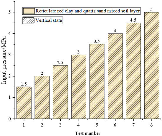 The test procedure consists of four steps. First, the C-DP drilling rig was adjusted to the state of vertical direct push drilling, as shown in Figure 8, and the inclination angle of the borehole was 0°. Second, the drilling speed adjusting lever was changed to the drilling state. Third, the parameter calibration was performed with input pressures in the range of 1.5–5.0 MPa. Fourth, suitable input pressures were selected for the simulated soil drilling test. Where, in the process of the parameter calibration, the input pressure of the hydraulic motor depends on the test scheme in Figure 9.